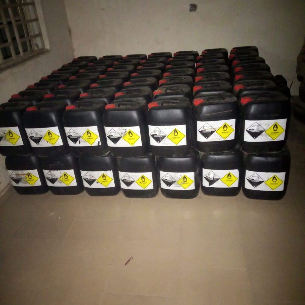 He explained that the substances were stored in one hundred jerricans, each with a capacity of 25 litres, and were suspected to pose serious threats to public safety and the environment.